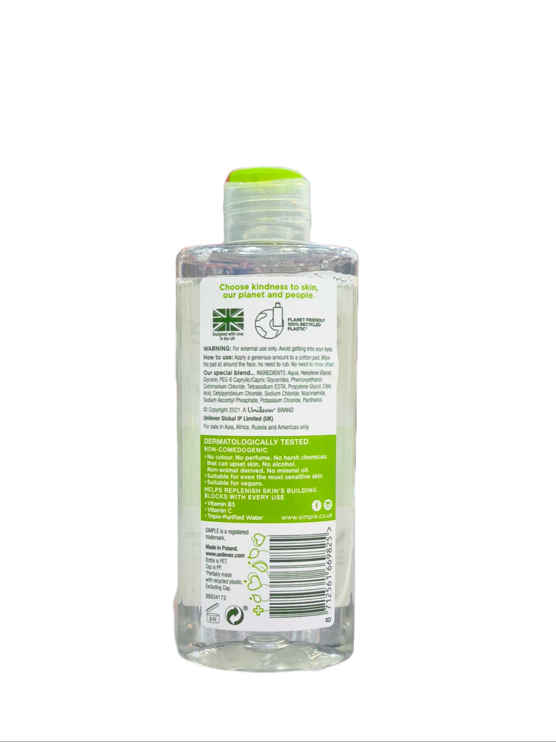 میسلار واتر یک پاک کننده صورت است. میسلار واتر میتواند علاوه بر پاکسازی پوست از آلودگی محیط، انواع آرایش صورت را نیز کامل پاک کند. میسلار واتر سیمپل یک محصول مناسب برای انواع پوست است. در فرمولاسیون این میسلار مواد مضر، عطر و رنگ استفاده نشده و مصرف آن هیچگونه مشکلی برای پوست ایجاد نمیکند. از دیگر مزایای بسیار خوب پاک کننده صورت سیمپل میتوان به رطوبت رسانی آن اشاره کرد که باعث مرطوب شوندگی پوست به مدت 4 ساعت میشود. با استفاده مرتب از این محصول پوست شما همیشه تمیز، شاداب و بدون چروک باقی خواهد ماند. حجم میسلار واتر سیمپل 200 میل می باشد